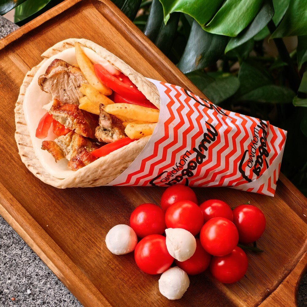 Курочка приготовленная на вертеле, лепешка со средиземноморскими травами, спелые томаты, сыр моцарелла, сырный соус, картофель фри, сыр пармезан Б 68,7 Ж 87,2 У 99,9 1465к