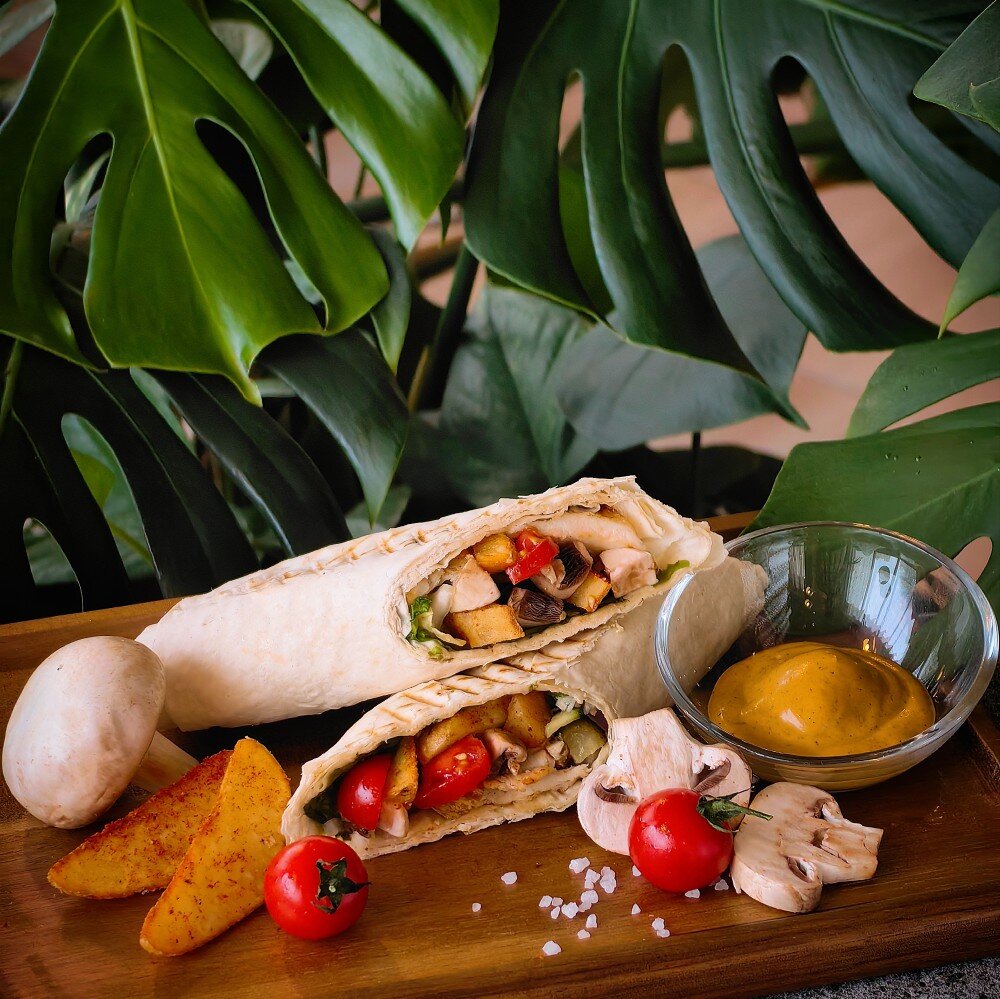 Без мяса!Сочная шаурма с большим количеством овощей и горчичным соусом. Хрустящий лаваш, обжаренные картофельные дольки, ароматная пекинская капуста, а также свежие томаты, огурцы и лук. Особую пикантность вкусу придаёт грибное рагу. С легкой остринкой!