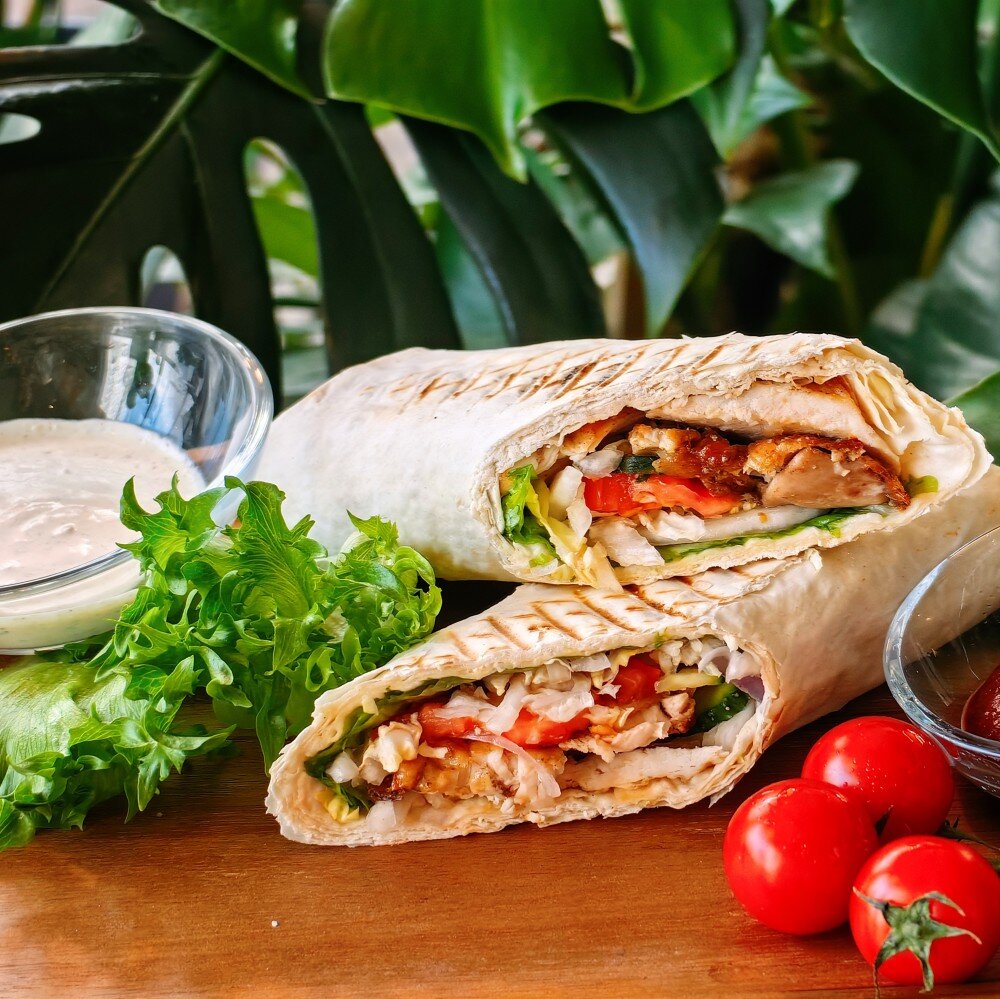 Тонкий лаваш, курочка на вертеле, микс капусты, спелые томаты, свежие огурцы, лук, зелень, красный и белый соус Б 34,2 Ж30,7 У64,9 678,0к