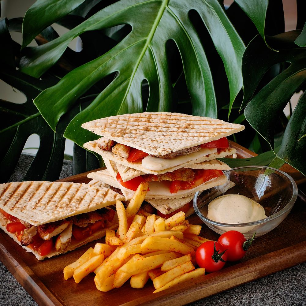 Сэндвич из 2х лепешек с курочкой на вертеле, копчеными колбасками, спелыми томатами, легендарным соусом Гриль , маринованными огурчиками и сыром моцарелла. Подается с картофелем фри и соусом кетчинез