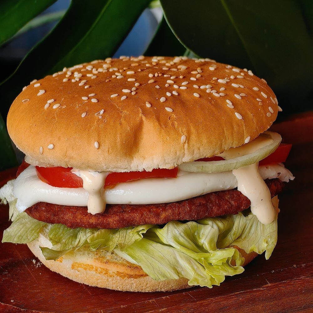 Сочная котлета из говядины в булочке с кунжутом, хрустящий салат айсберг, нежный сыр моцарелла, репчатый лук и свежий помидор. Всё дополняет соус Цезарь.