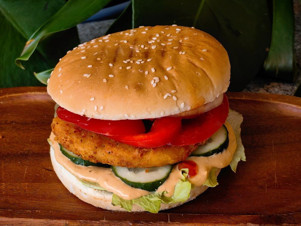 Бургер «Тайская цыпочка» — это аппетитный бургер с сочной котлетой из цыплёнка, покрытой хрустящими сухарями, свежий салат айсберг, огурчик, сладкий перец, лучок — всё это заключено в ароматную булочку с кунжутом. Яркость и остроту придаёт соус чили-майо и перчик халапеньо.