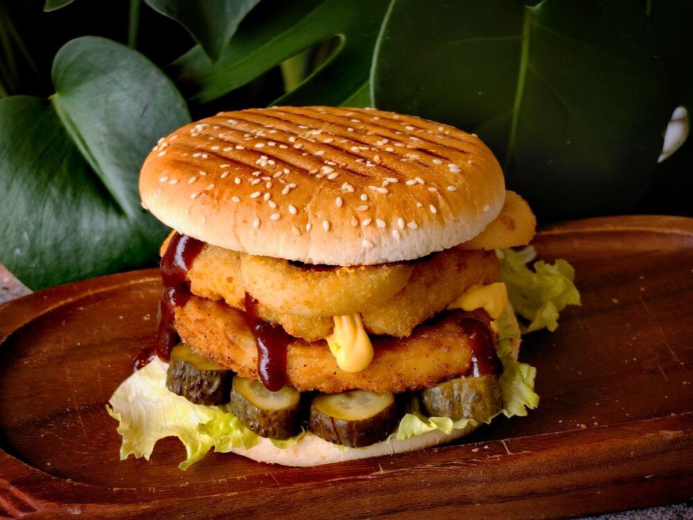 Бургер «Дубайский Шейх» - это сочная куриная котлета в хрустящих сухарях, салат айсберг, маринованный огурчик, луковые кольца в панировке и сырные палочки из моцареллы на мягкой булочке с кунжутом. Сочетание сырного соуса, соуса барбекю и сычуаньского майонеза придаёт бургеру неповторимый вкус.