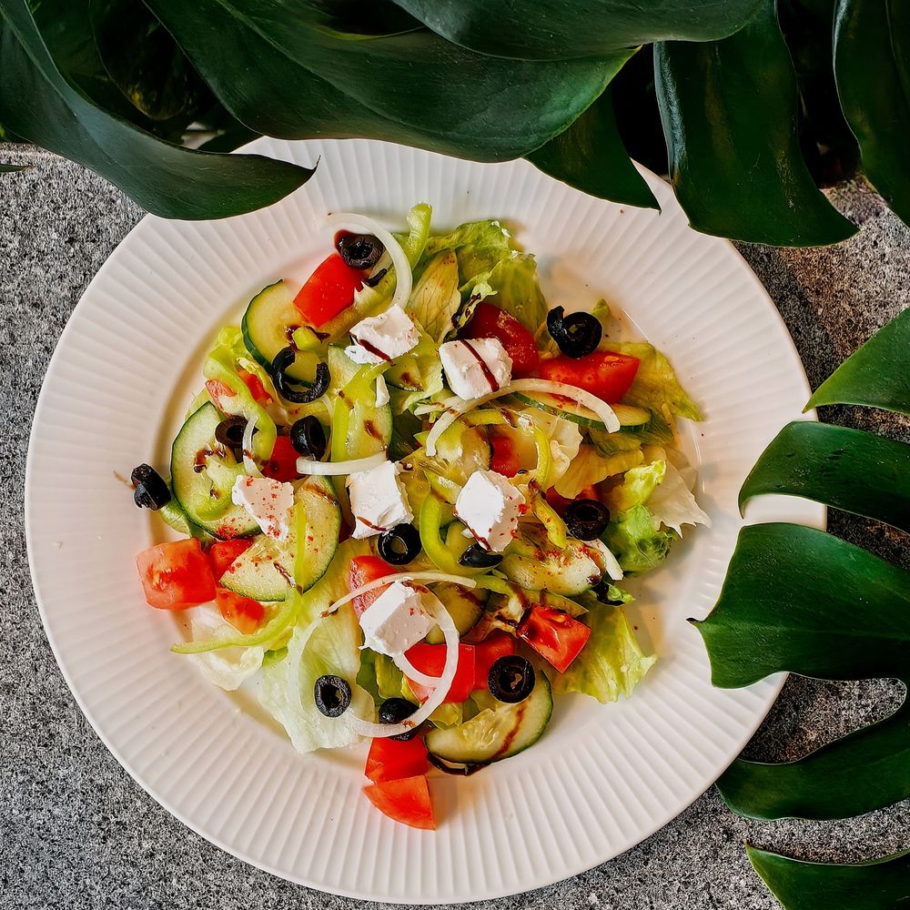 Свежие огурцы, спелые томаты, листья хрустящего салата, черные маслины, лук, сладкий перец, сыр фета, оливковое масло с ароматными специями