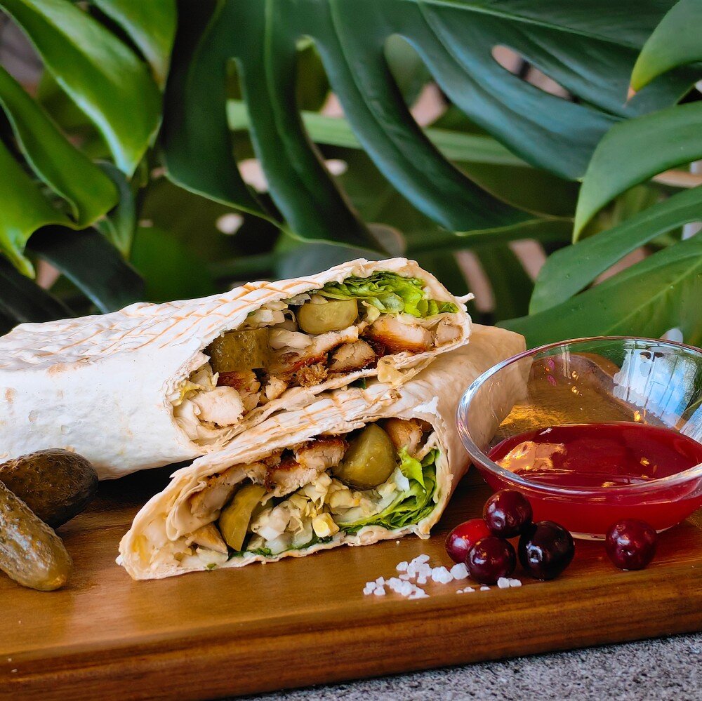 Тонкий лаваш, курочка на вертеле, микс капусты, клюквенный соус, маринованные огурцы, лук, майонез Б33,1 Ж40,6 У62,2 754.0к